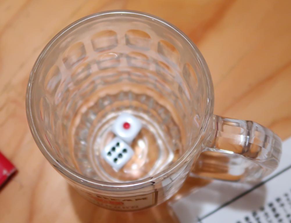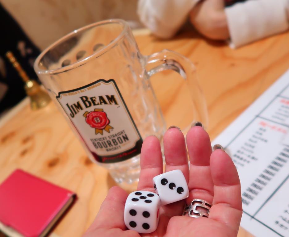 サイコロ二つをジョッキに入れて、ゾロ目が出たら、ハイボールが無料。