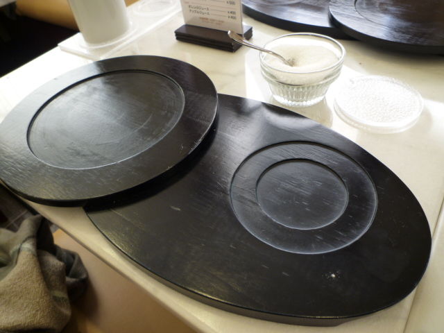 左にケーキ皿、右にドリンク。