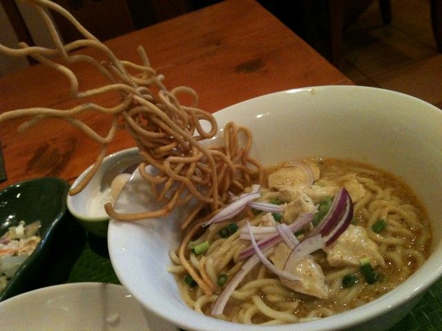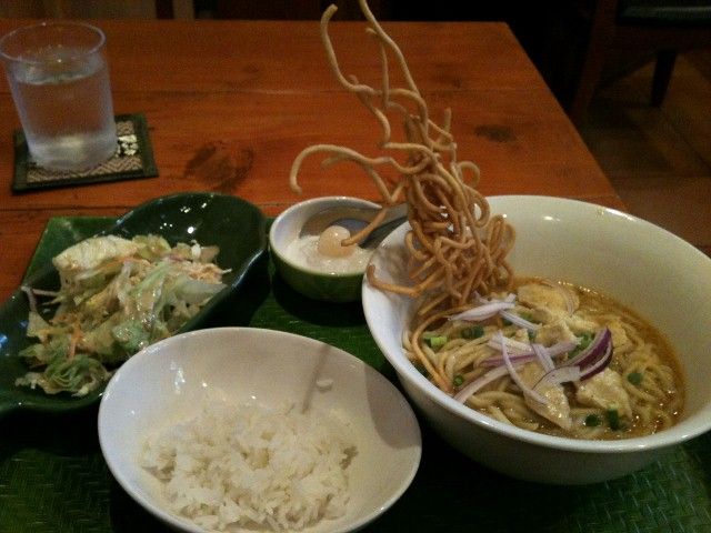 2012年11月14日 Lemongrass House(レモングラスハウス) 中崎町のタイ料理。カフェのなんちゃってエスニックではなく、本格的。食べたかったのがこれ、カオソイ!インパクトあるよね~~。カオソイはタイ北部の、ココナッツカレーラーメン。同じ麺の、ゆでと揚げが同時に食べられ、最後にはご飯も入れて、ごめん、ちょっと汚くて。ライスカレーもまたうまし!サラダつき。デザートと薬味。タピオカじゃなくて、ライスプディングぽいものだったような。またもや記憶が怪しげ。タイの甘いアイスティ。練乳で甘いけど、カレーのあとだから嬉しい。ほかのメニューもいろいろ食べたい!! < 前の記事次の記事 > トラックバック