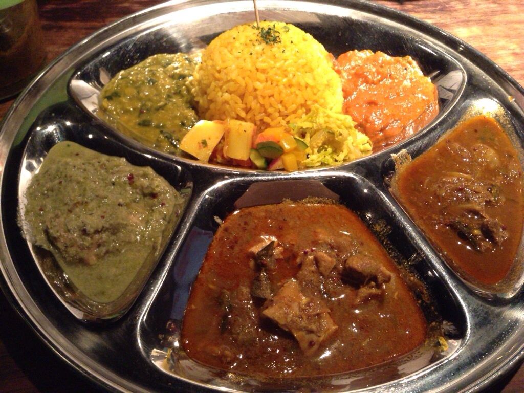 2015年02月10日 カレー週イチ 月曜日しかやってないカレー屋さんでランチ。 全部のせ 1200円で、カレー5種類堪能~。 まずはこちら。 ビーツと、豆と、なす。 この日のカレーは、右上から時計回りに、 ・イタヤ貝パキスタン ・スリランカ鹿 ・スリランカチキン ・パクチーチキン ・ほうれん草入りダル ライスは濃い黄色。 最初は少しずつ味わって、次第に混ぜ混ぜしていただきました。 スパイスたっぷりでそれぞれ美味しい~! 次回はデリがいろいろのった、スリランカプレートを食べてみたいな。 < 前の記事次の記事 > トラックバック