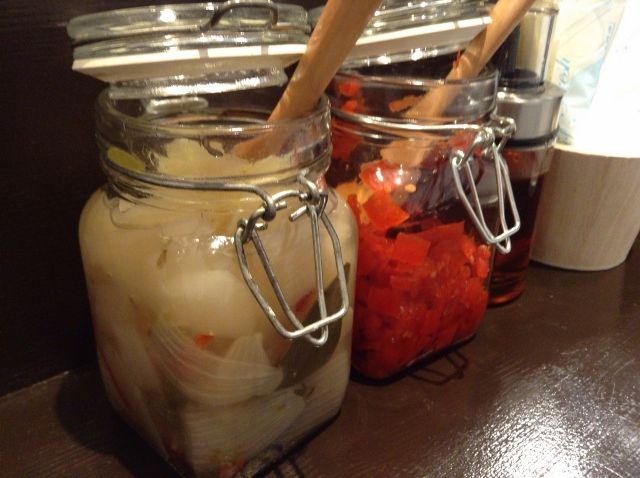 卓上の玉ねぎのピクルス(ハーブが香っていました)や福神漬はフリー。