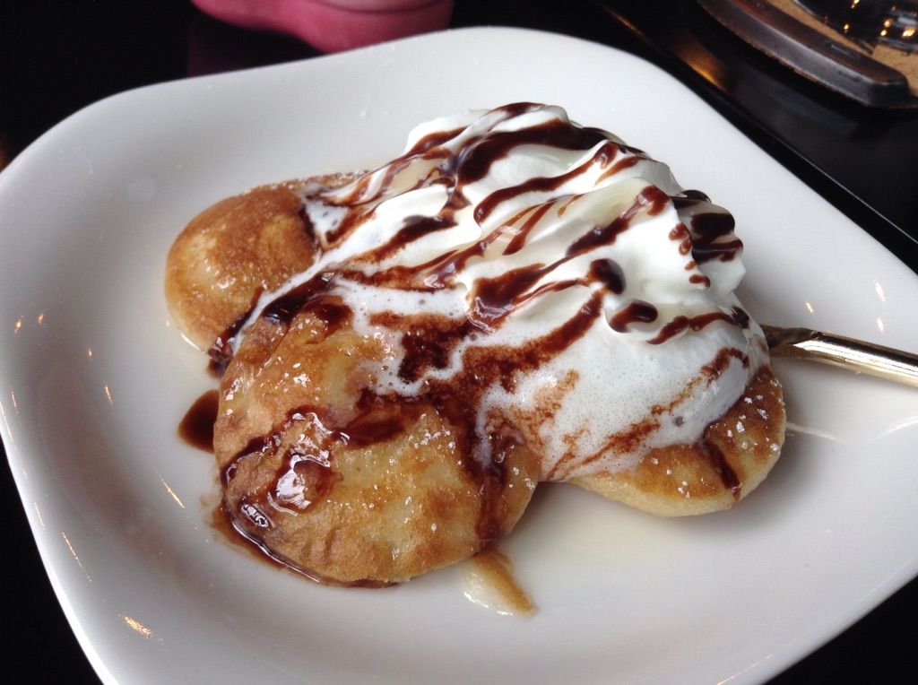 プチパンケーキにクリームとチョコシロップがけ。