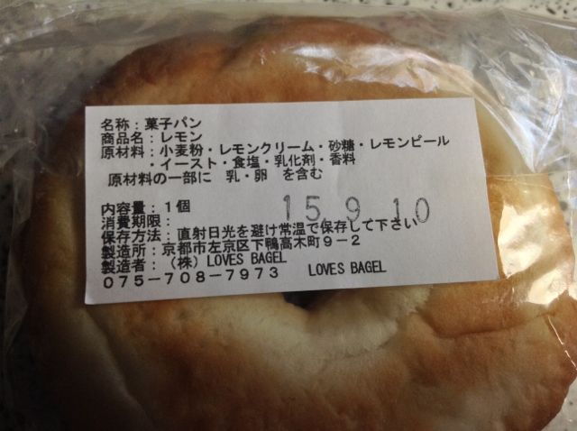 2015年09月12日 ラブズ ベーグル (LOVES BAGEL) 梅田の阪急パンフェア記事を早く挙げなければ~~^^;京都のラブズベーグルは高槻にも支店があるそうですが。種類が多かった。レモンの買ってみました~。¥237ふにゃっとしていて、形だけベーグルって感じ。もっと弾力があって欲しい。そして表面がぱしっとしているのがいいな。トーストすると、レモンピールとレモンクリームがほどほどに味わえて、美味しい菓子パンでした。ラブズ ベーグル 関連ランキング:ベーグル | 松ケ崎駅、茶山駅 < 前の記事次の記事 > トラックバック