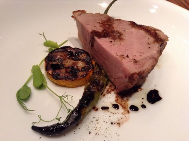 「シャラン鴨胸肉のロースト キャラメリゼしたバナナの燻製 フォアグラとビーツ」