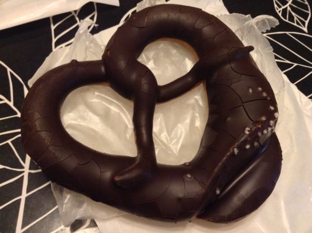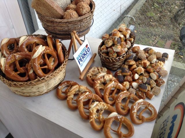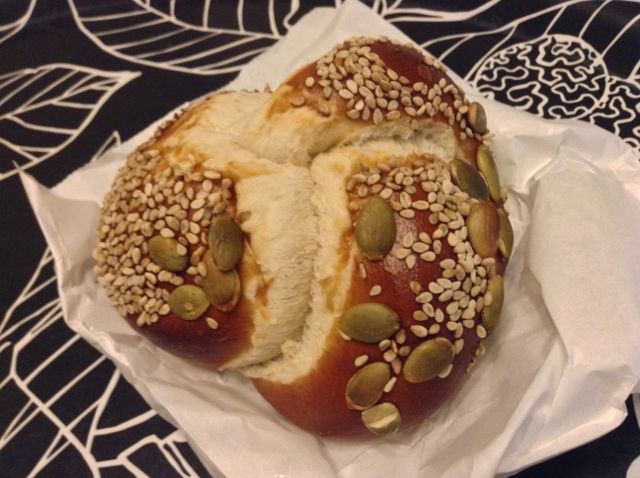 かぼちゃの種と黒ゴマをトッピングしたプレッツェル生地のパン。