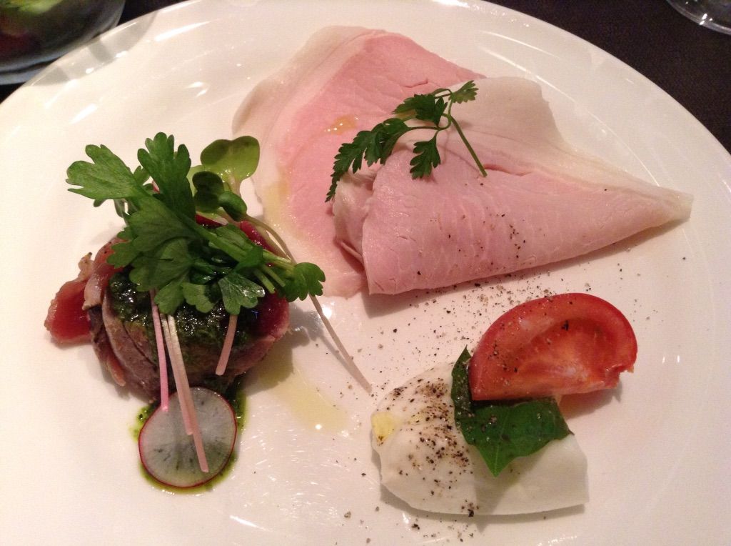 カツオのサルサヴェルデ、自家製ハム、カプレーゼ。