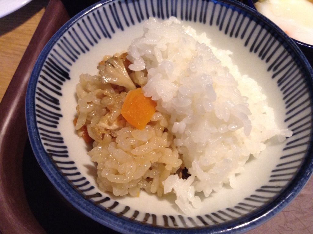 広島赤鶏の炊き込みご飯(だったと思う)と広島のコシヒカリ?半分ずつー。