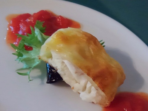 魚のパイ包み。揚げナスとトマトのソース添え。