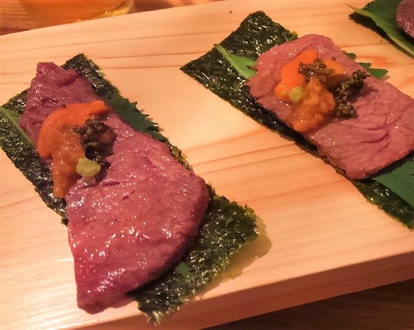 びっくり~~! サシの入った松坂牛のイチボに、生ウニがのってる~!