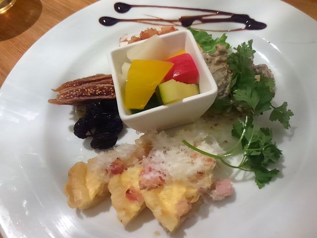 砂ずりの粒マスタード、 野菜のピクルス、朝曳きの鶏蒸し?、キッシュ、
