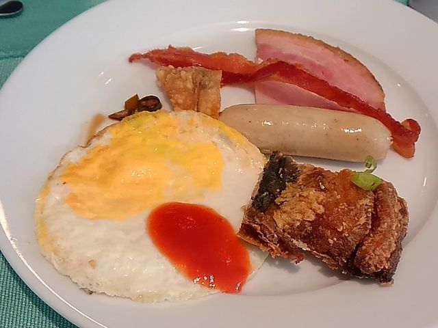 目玉焼きは、まとめて作ってあり、黄味の色が薄い。