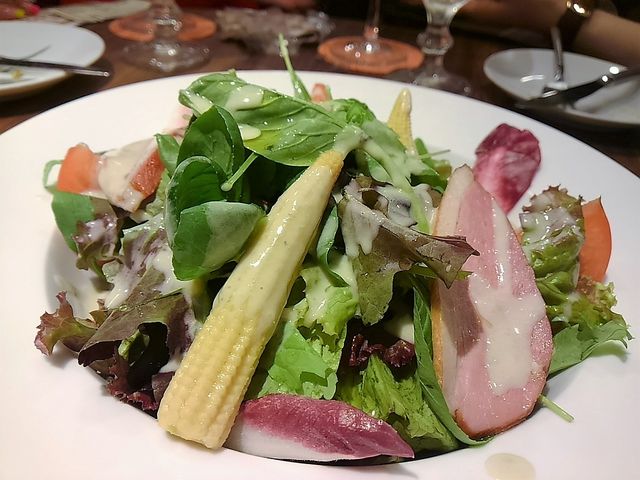 チーズクリームドレッシングのかかった新鮮サラダ。美味しい。野菜ススム!