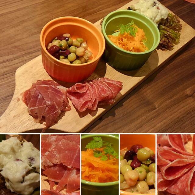 豆マリネ、ミラノサラミ。