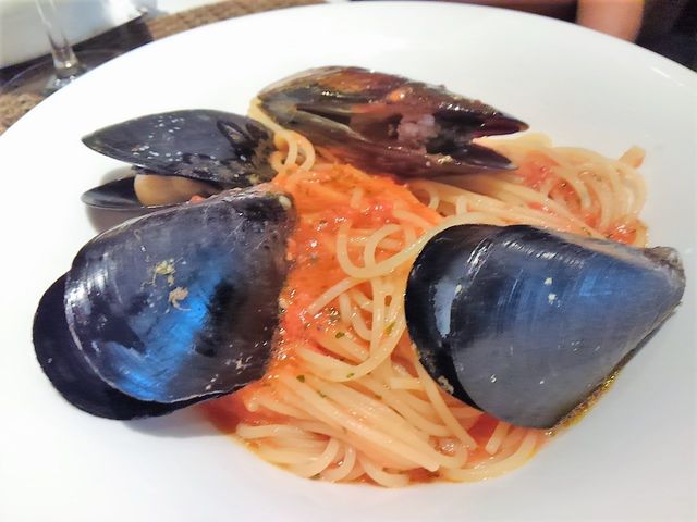 北海道昆布森産ムール貝のピリッと辛いトマトソース仕立てをスパゲティで