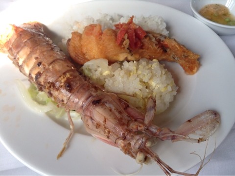 魚介を売りに来たお兄ちゃんから、大きな生きたシャコを購入。