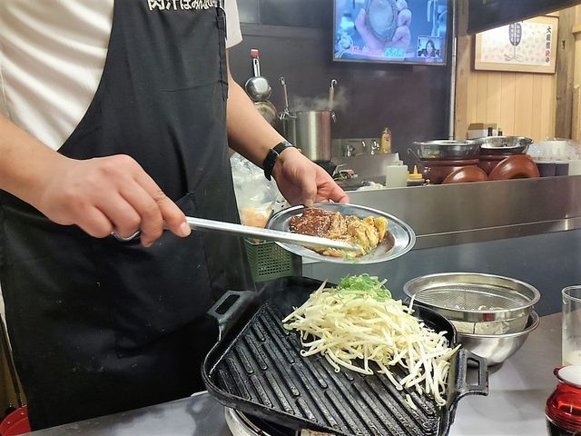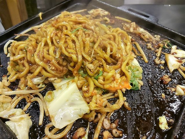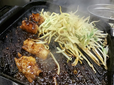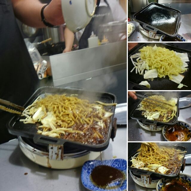 鉄板を交換し、野菜、麺を炒めて、この肉汁入りのタレを絡めて~~、