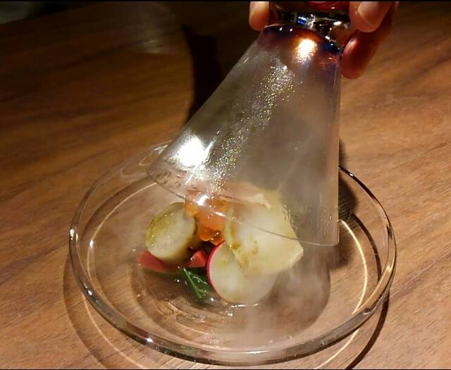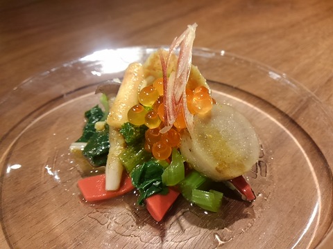 小松菜、あわび、いくら、十勝のごぼうなどが、燻製の薫りで。