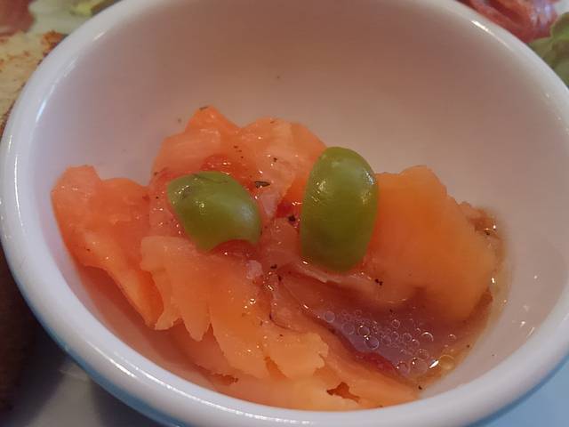 ヒモ付きホタテとグリーンオリーブの生パスタ。