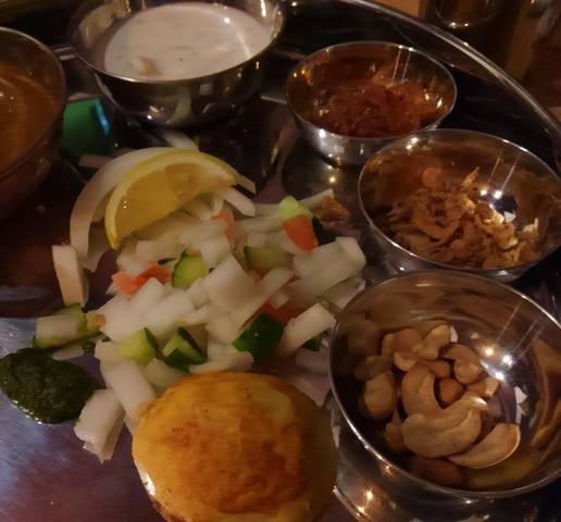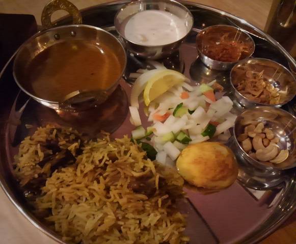 グレイビー(カレーソース)、オニオンスライス、レモン、カチュンバル(生野菜のスパイスあえ)、スパイスゆで卵、ナッツ、フライドオニオン、海老の甘辛煮、ミントソース、ライタ(ヨーグルト)。