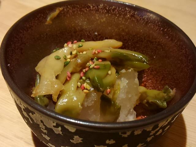 お付き出し、鬼おろしにザーサイとカラフルゴマ。