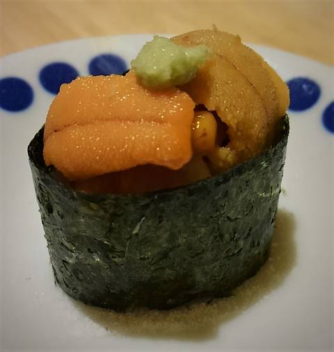 湯引きしたささみ(ほぼ生)にウニをたっぷり乗せた軍艦巻きー!