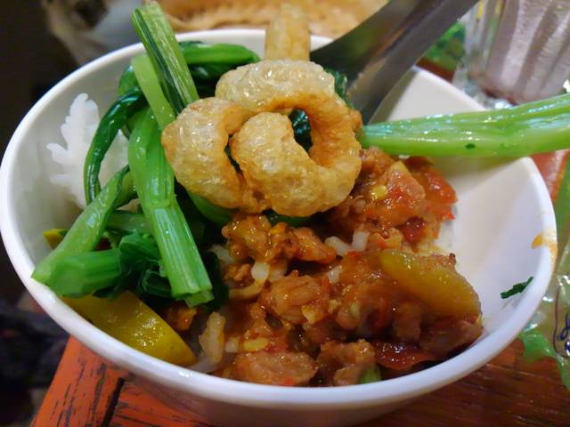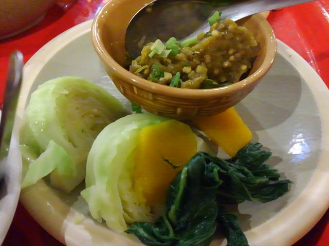 豚の皮をカリッカリに揚げたもの(ケップ・ムー)、ゆで(蒸し?)野菜。