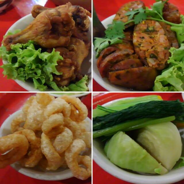 鶏のから揚げ(ガイ・トート)、豚の血が入ったチェンマイのソーセージ(サイウア)。