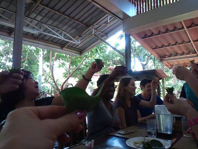 葉っぱ(bitter leafと言っていた)を二つ折り二回してカップのようにしたら、その中に具を詰めていく。