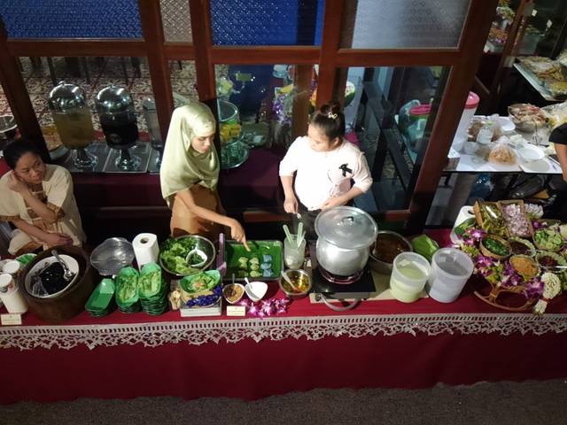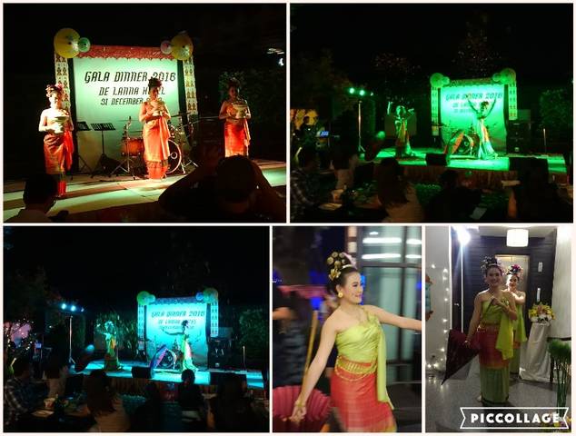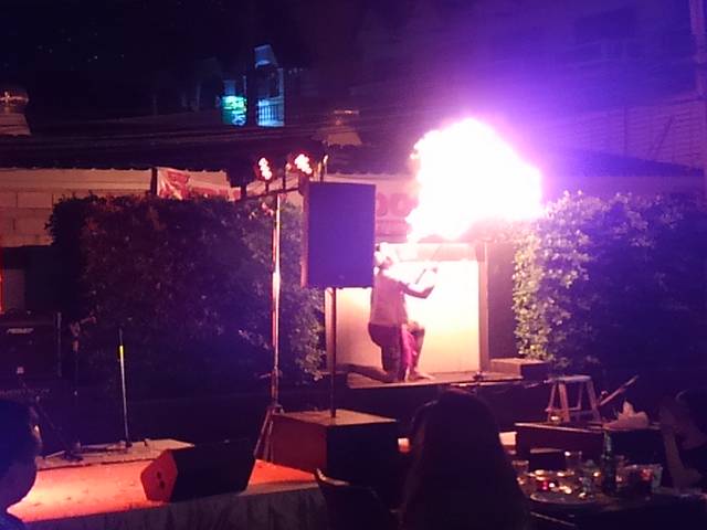 中庭のステージで踊りなどのショーを楽しみます。