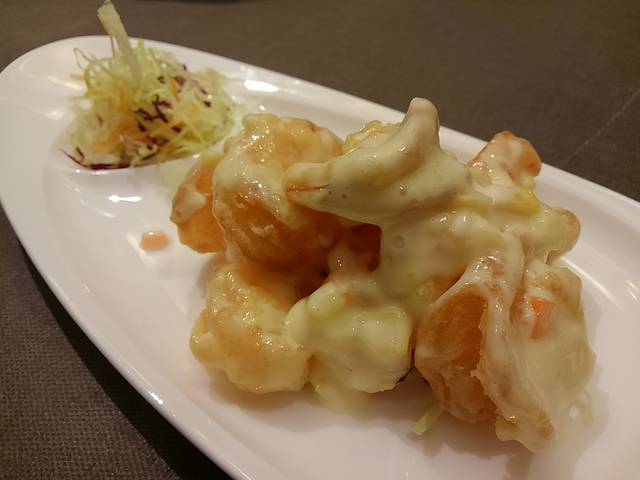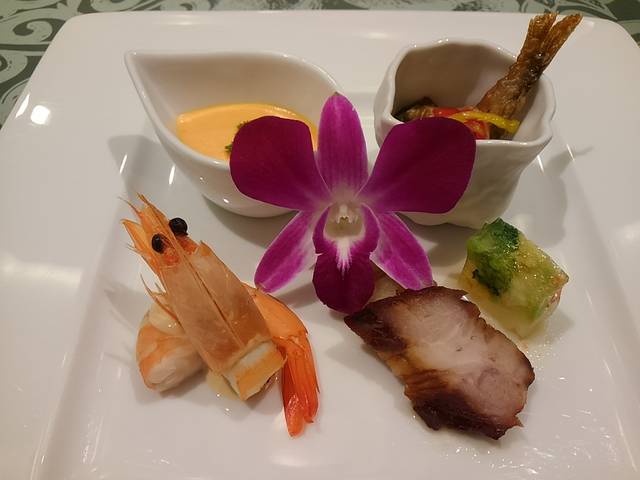 塩水につけたエビを蒸したものにオーロラソース、自家製チャーシュー、