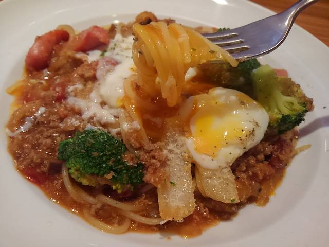 ソーセージとブロッコリーのピリ辛 半熟玉子乗せ