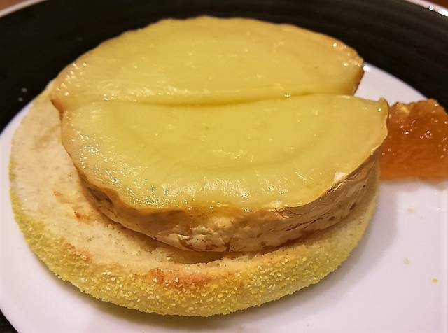 イングリッシュマフィンの上に燻製カマン、林檎ジャム添え。