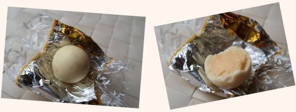 ホワイトチョコレートのシェルに、マンゴーピューレが入ったホワイトチョコレートのフィリング入り。