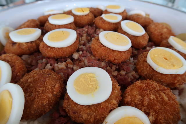 ライスに肉味噌っぽいそぼろ(コーンビーフハッシュ)と、ミンチカツ、ゆでたまご。ソースをかけて。