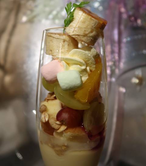 バナナのキャラメリゼ、グラノーラ、プチサイズのパンケーキ、カラフルマシュマロ、マスカルポーネのホイップなど。