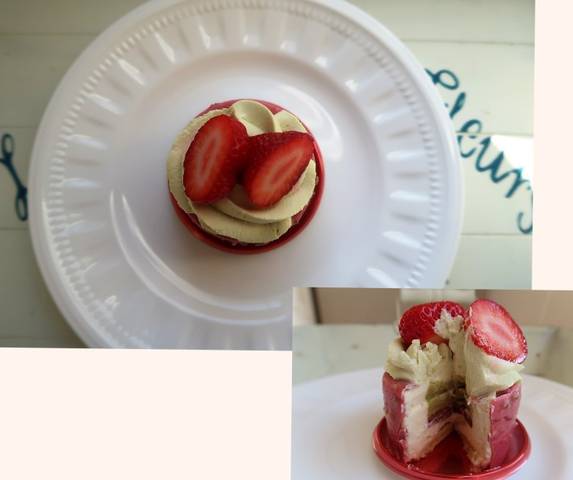 ホワイトチョコの軽いムースの中に、ピスタチオのブリュレと、野イチゴ&フランボワーズのソースを閉じ込めている。