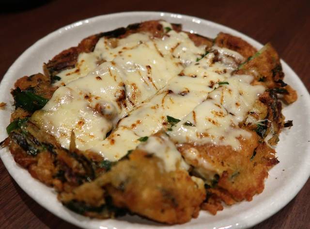 ◆海鮮チヂミ(チーズトッピング)キムチトッピングもあり。