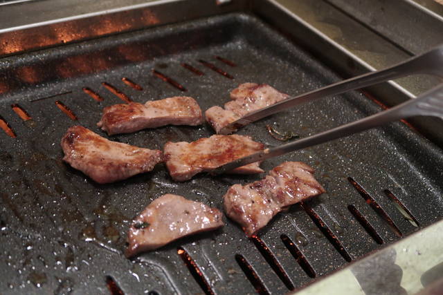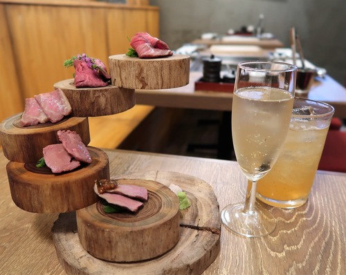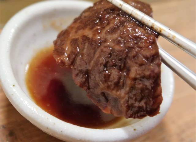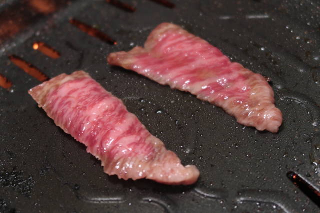 さっと滑らすように「すべり焼き」した、レアより生っぽい「ブルーレア」で。
