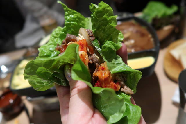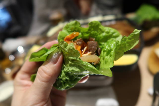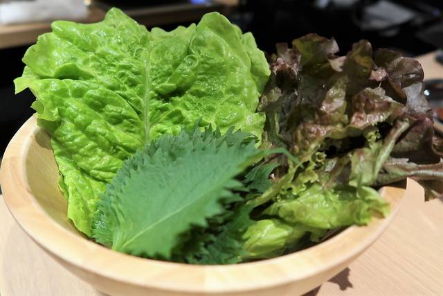 葉野菜、お肉、キムチ、たれの順にのせて包んで食べると、なおおいしい~!