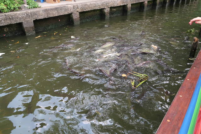 パンを投げて魚に食べさせるアトラクション。