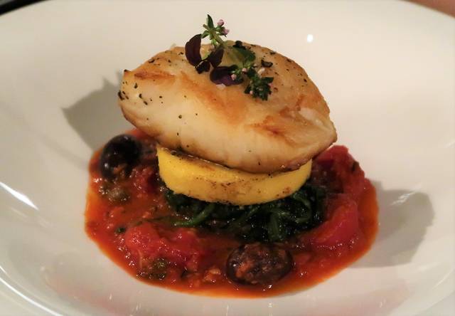 白身魚のグリル、コーンのポレンタ。