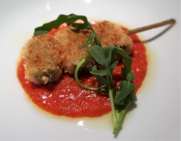 スープで飲めそうなマイルドな酸味のトマトソース。串カツっぽいビジュアル。