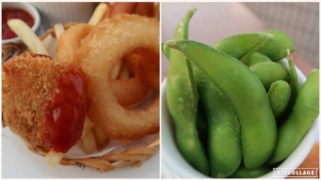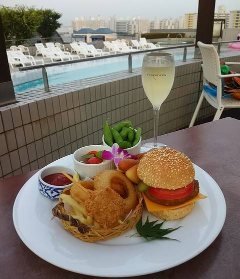 プールサイドレストラン&バーペルゴラでオーダーできる、アメリカンなおつまみ、バーガーやラーメンなどの軽食。
