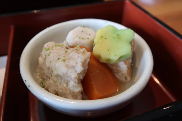 ゆず風味のつみれ、、もち麩、ひりょうず、人参、サトイモなど。だしは甘め。