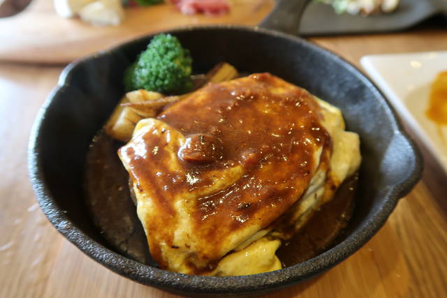 鉄板焼きのハンバーグをオムレツに。