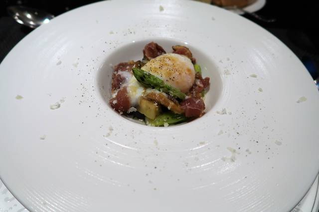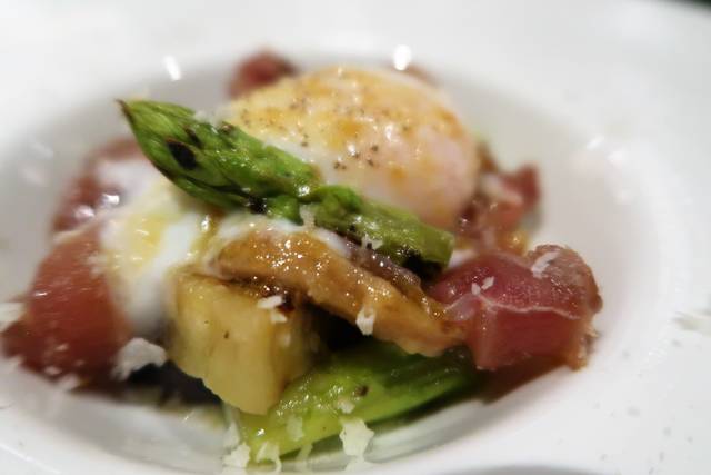薩摩地鶏の燻製 グリルしたアスパラと加茂茄子と温泉卵で
