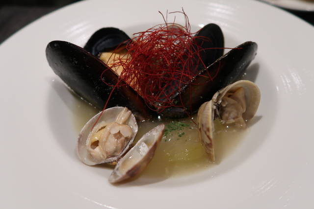 とろみをつけた冬瓜とアサリとムール貝のスープ仕立て