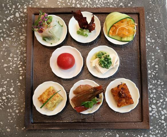 ・もやし・人参・セロリ・ロースハムなどに炒り焼きの湯葉をのせたもの