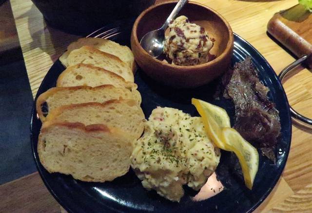 燻製ポテトサラダ、自家製ジャックビーフジャーキー、レーズンバターの単品を特別に盛り合わせで。