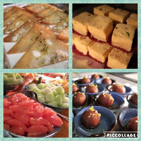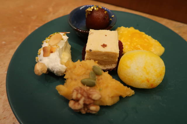 マンゴーライスプディング、グラブ・ジャムン、ラスグッラ、フルーツカスタードクリーム、ソアン・パブティ、豆のハルヴァ、シャーヒートゥクダ。